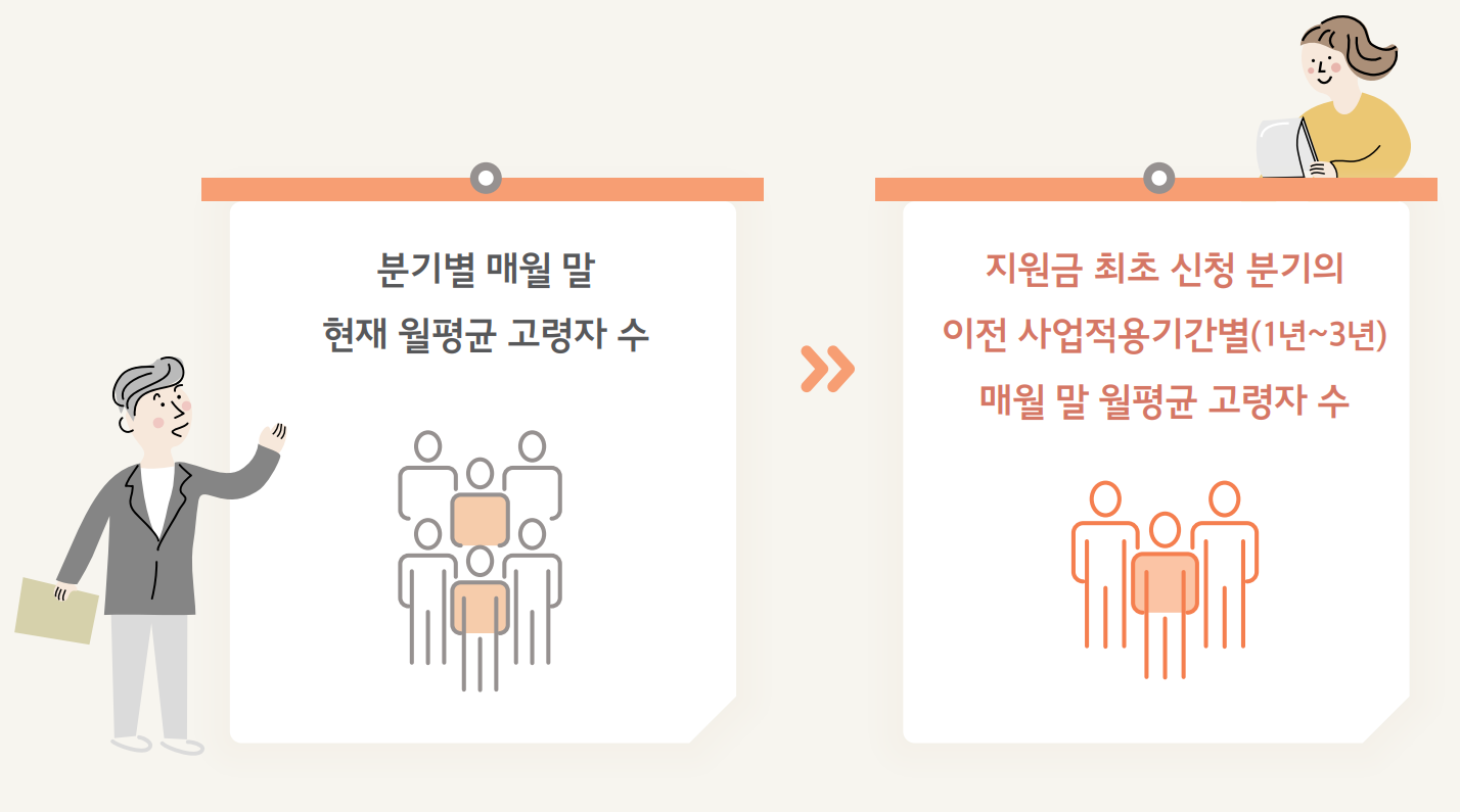 - 분기별 매월 말 현재 월평균 고령자 수가 지원금을 최초로 신청한 분기 이전 사업적용기간별 (1년~3년간) 매월 말 월평균 고령자 수보다 증가해야 합니다.