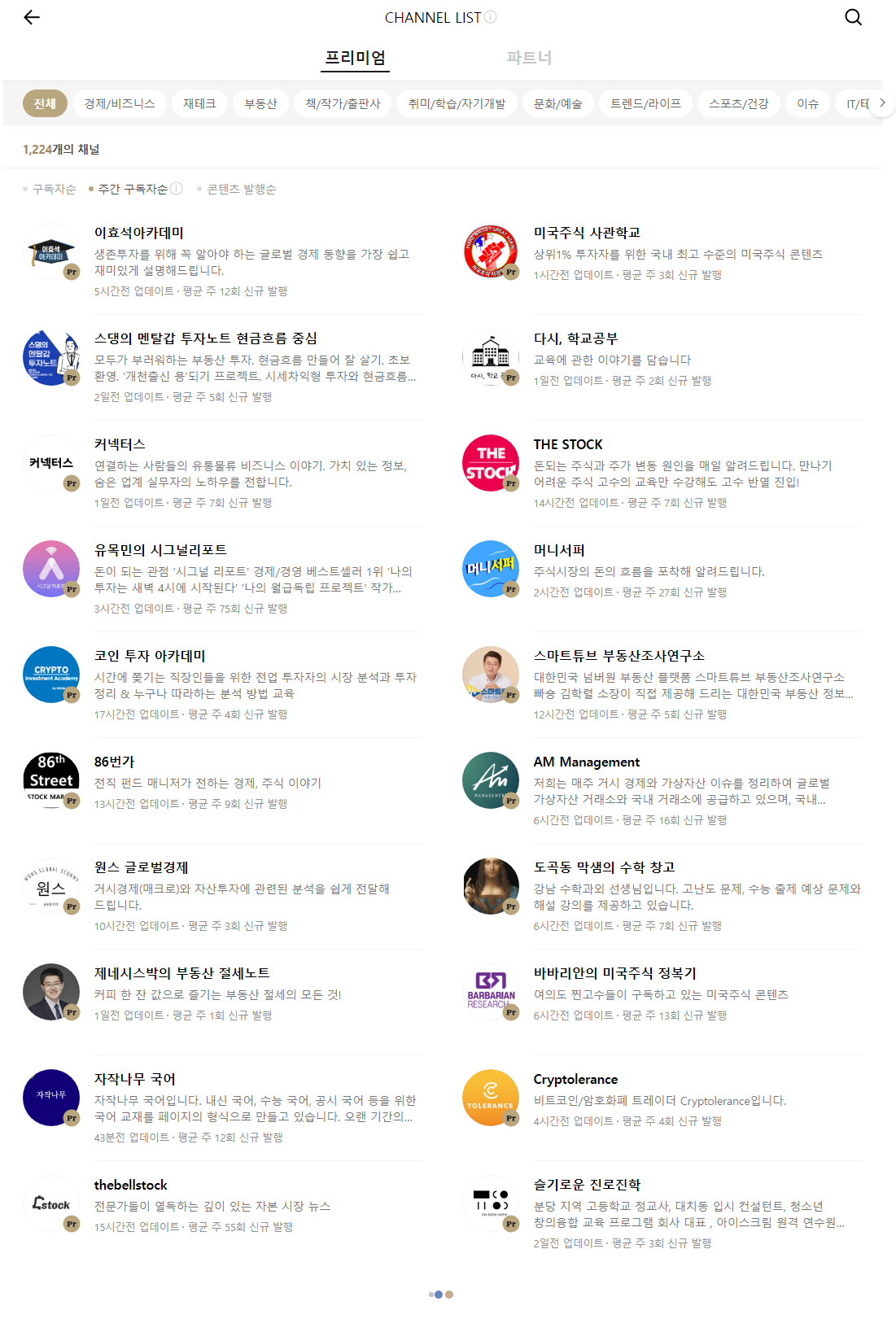 - 주요 채널 : THE STOCK, 코인데스크 프리미엄, 바바리안의 미국주식 정복기, 치과아저씨의 투자 스케일링 등