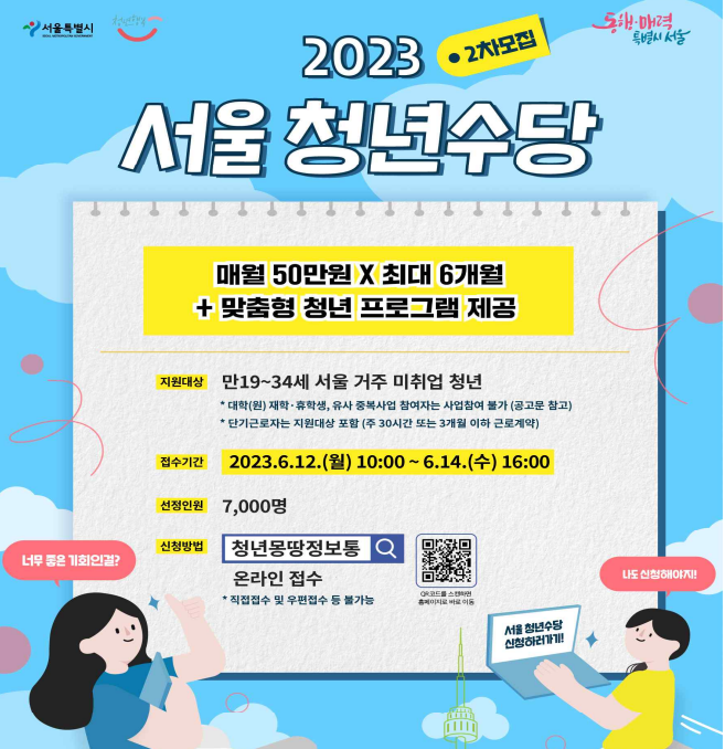 서울시가 '23년 서울 청년수당 2차 참여자 7천명에 대한 모집을 6/12(월) 오전 10시부터 6/14(수) 오후 4시까지 3일간 진행한다고 밝혔다. 청년 수당은 서울에 거주하고 있는 만 19~34세 미취업 또는 단기 근로 청년에게 활동지원금 (월 50만원 최대 6개월)을 지급하는 사업이다. 오늘은 청년수단 2차 참여자 모집과 관련해서 알아보기로 한다.