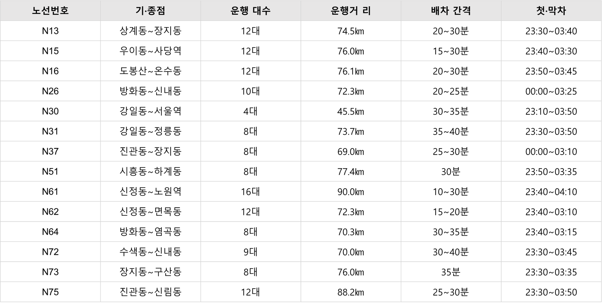 - 서울 시내를 운행하는 14개 노선의 번호 및 기/종점, 배차 간격 등