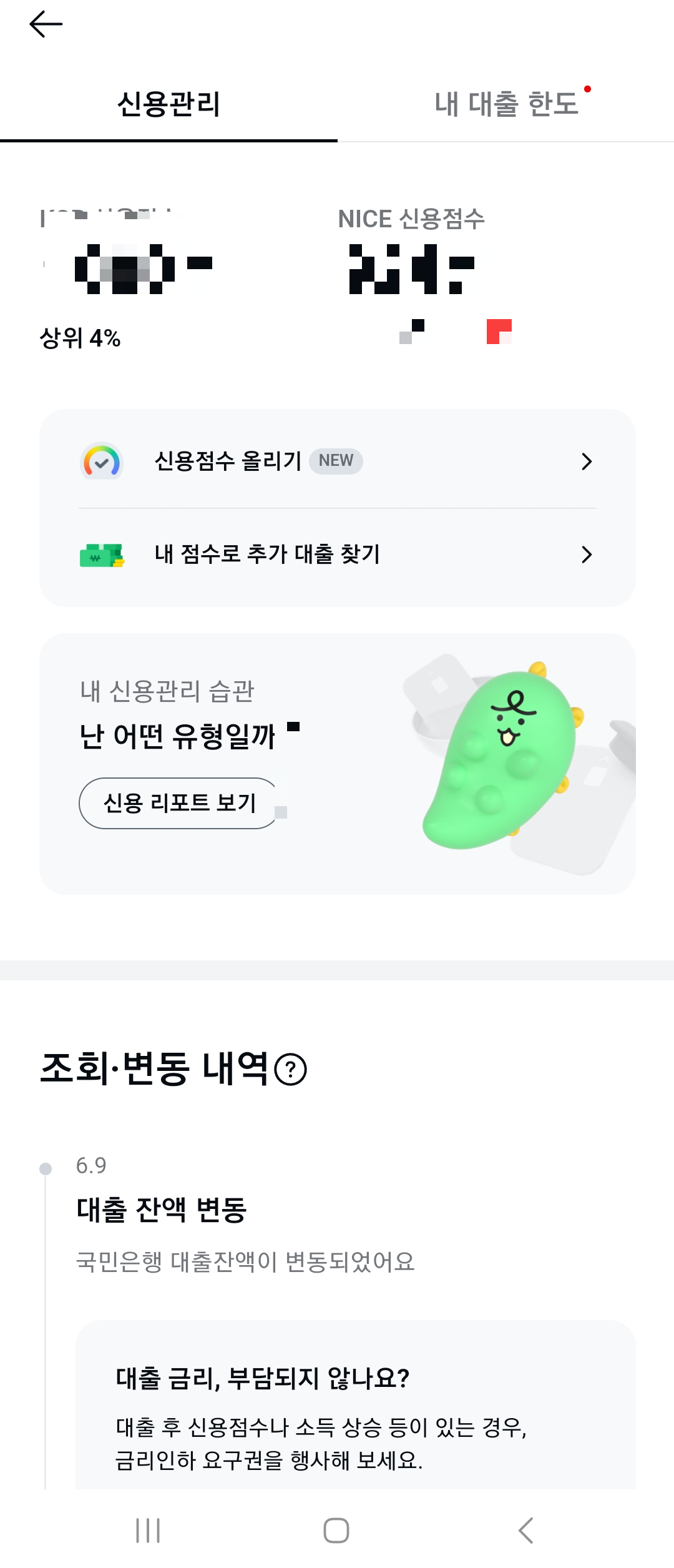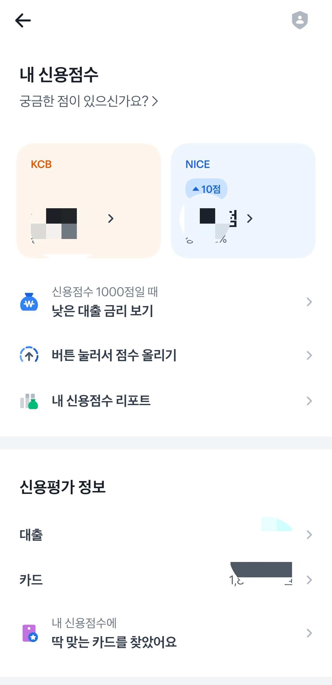 - KCB 점수와 NICE 점수 2가지의 점수에 대해서 보여주며, 신용점수를 기반으로 하여 대출 금리 비교 등 대출 서비스 연동 가능