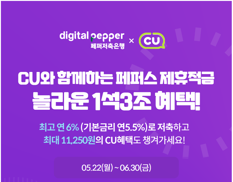 페퍼저축은행과 CU가 손을 맞잡고 6%의 적금 상품을 내놨다. CU의 앱인 포켓CU에서 최대 6% 금리 '페퍼스제휴 적금 위드 CU'를 판매한다. 기본금리 연 5.5% 고정 상품으로 시중 정기적금 상품 중 최고 수준 금리로 마케팅 수신에 동의하면 0.5%의 우대금리를 더해 최고 연 6%의 금리가 적용된다.