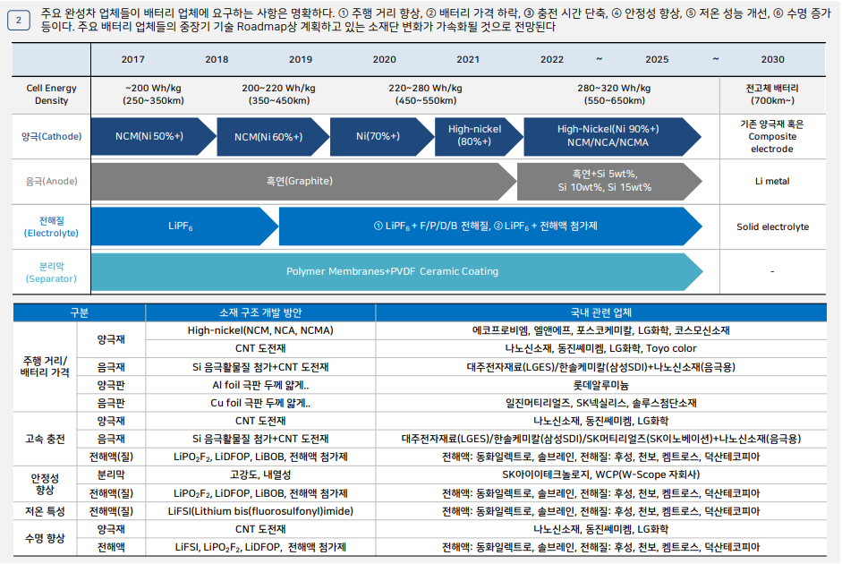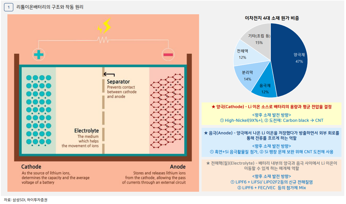 - 일반적으로 리튬이온배터리는 양극재, 음극재, 전해질, 분리막을 4가지 구성 요소로 말함