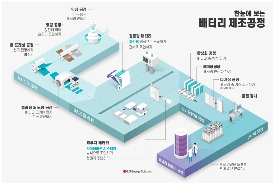- 리튬이온배너리의 제조공정은 <전극공정 → 조립공정 → 활성화 공정 → 팩 공정>으로 이르는 4개의 큰 Step으로 이루어짐