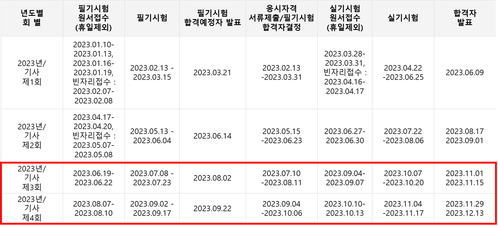 - (기사, 산업기사) 시험일정은 종목별, 지역별로 상이할 수 있음