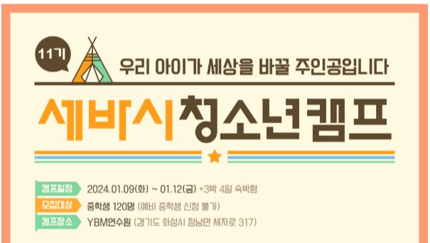 2024년 겨울 ('24.1월) 세바시 청소년 캠프 정보에 대해 공유하고자 한다. 금범 캠프는 11기 캠프 (1.9.화 ~ 1.12 금, 3박4일 숙박형)이고, 올해 초 겨울 9기 캠프를 필자 자녀가 참석했었다. 비용으느 다소 부담되지만 최종 목표인 스피치를 위해 3박 4일간 아이들에게 다양한 프로그램을 통해 충분한 값어치를 하는 유용한 캠프 프로그램이었던 것 같다.