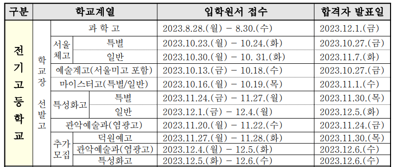 - 자사고·외국어고·국제고 전형시기, 교육감선발 후기고 지원 및 배정방법은 2023학년도와 동일